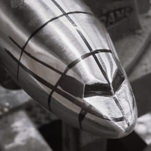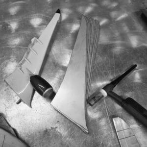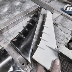 The wings and tail fins are made using 2mm stainless steel sheet. The wings not only taper, but curve upwards at the tips and have track covers fitted on lower edge.