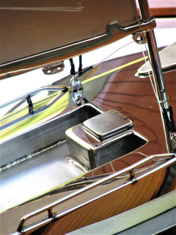 Her Stainless Steel hull is polished to a mirror finish with brushed folded jib on the foredeck. The cockpit is brushed with hatch, guard rail and topsides polished to contrast.