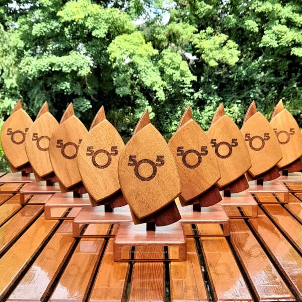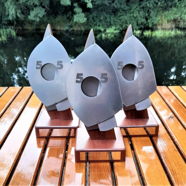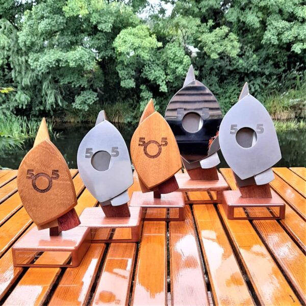 The trophies featured a mainsail, jib and spinnaker, welded and angled forward to give a 3D effect and the impression of movement. The spinnaker had a hole cut through the sail, with a ‘5’ etched into the stainless steel, to mirror the 505 logo.