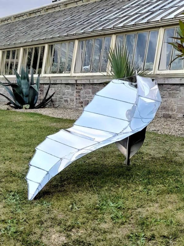 The sculpture’s support is crafted from three smaller leaves, seamlessly welded to the back, and also polished to a mirror finish.