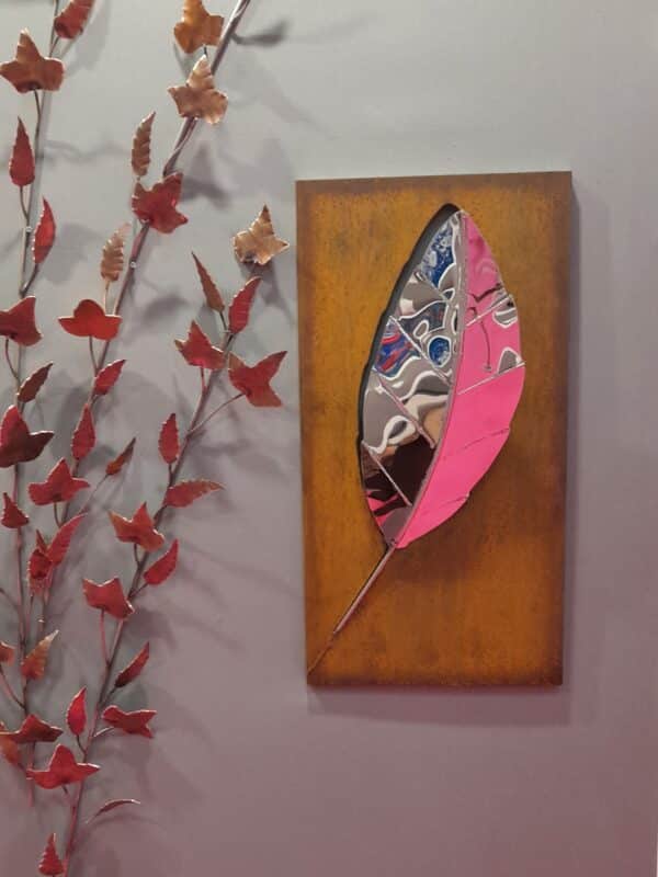 This sculpture features a highly polished Stainless Steel leaf which emerges from the outline of the mild steel background fixed at the stem.