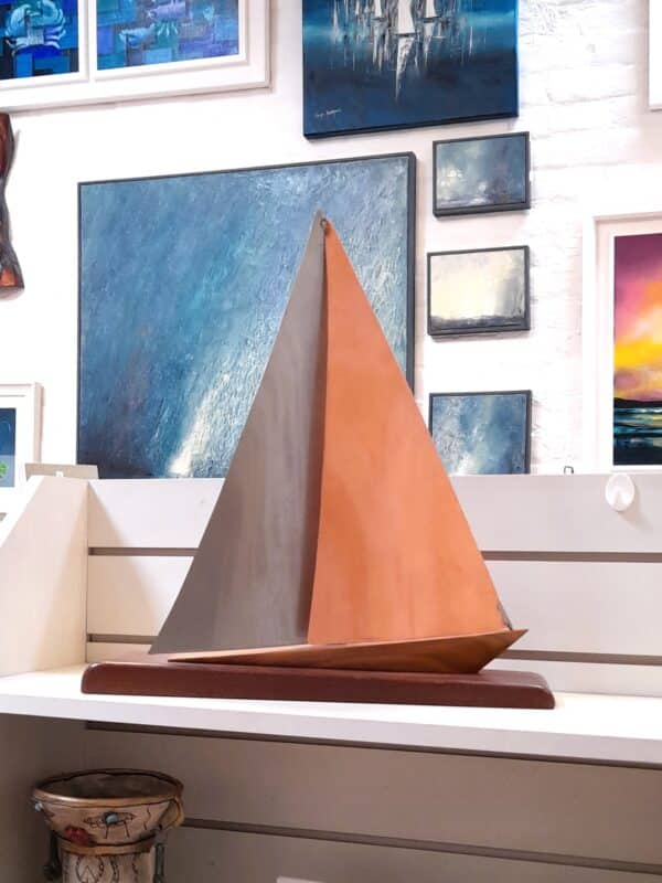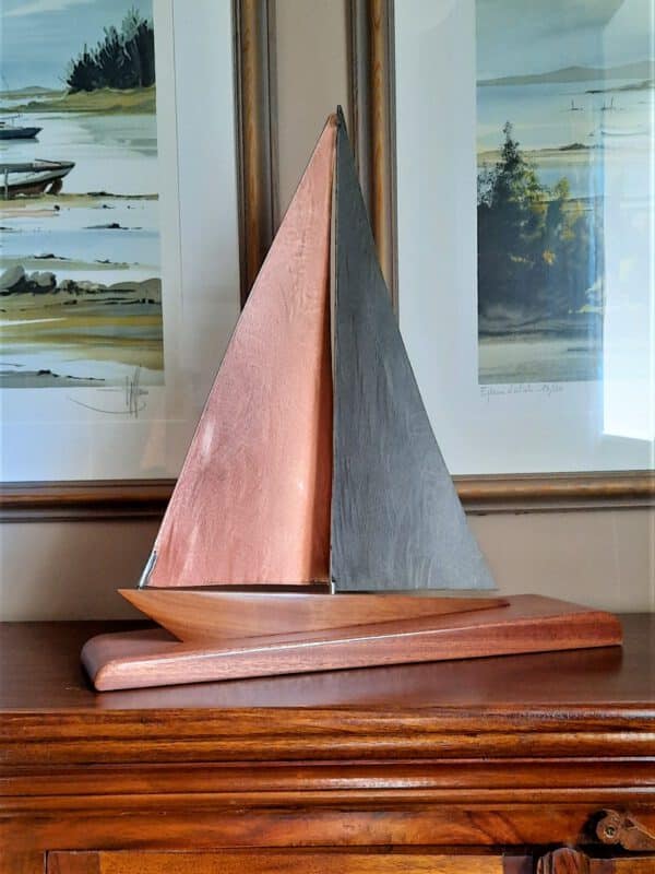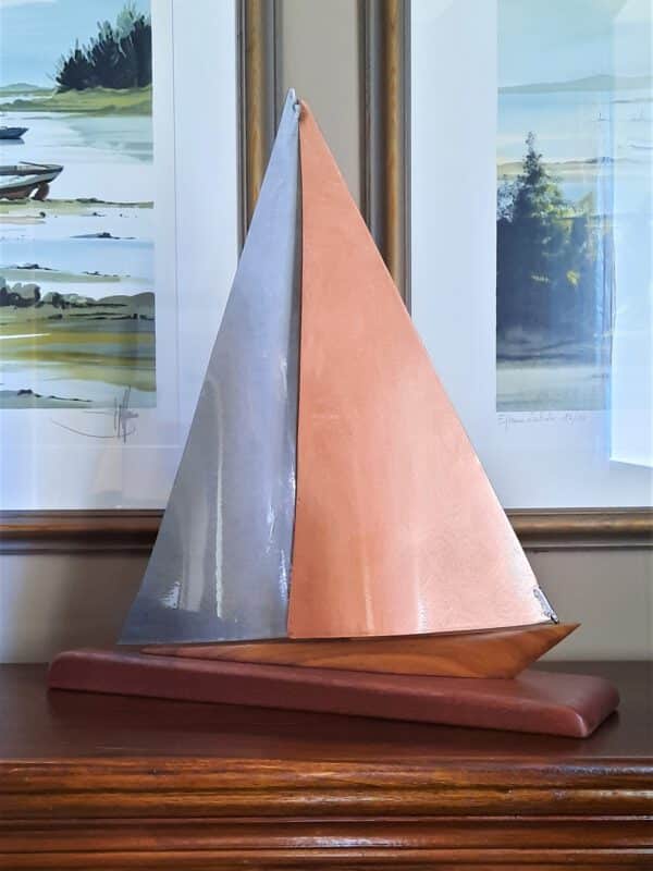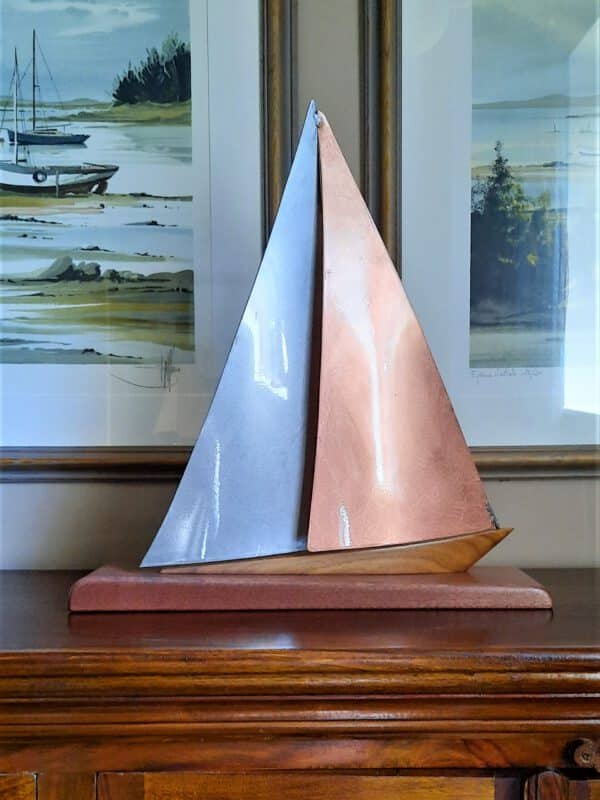 This stylised Yacht Design features brushed a Stainless Steel Mainsail and Copper Headsail with a lacquered finish.