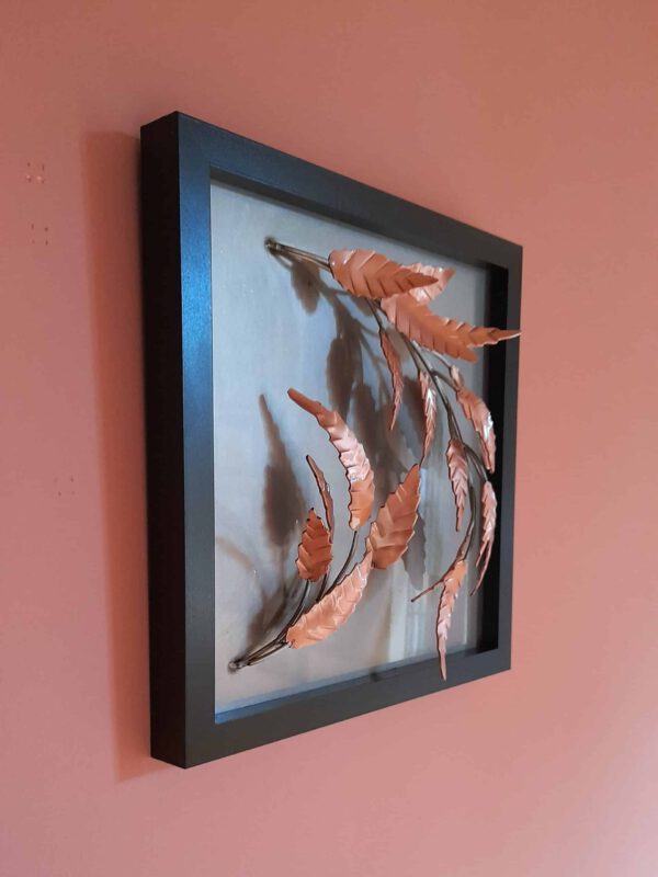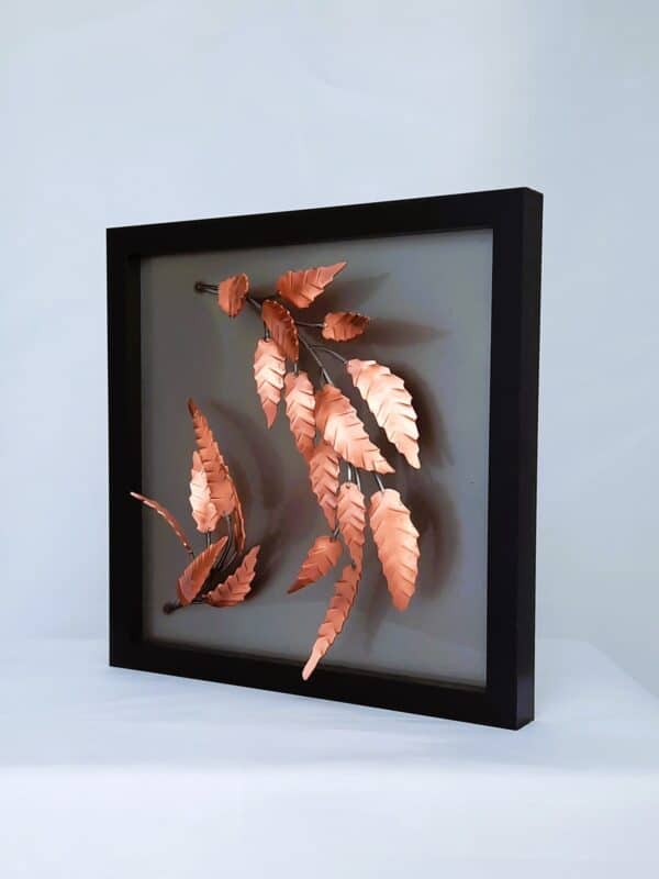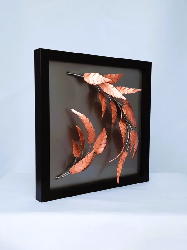 Featuring handcrafted sprays of copper leaves, each spray is mounted on a sleek stainless steel background and elegantly framed in a minimalist black border.