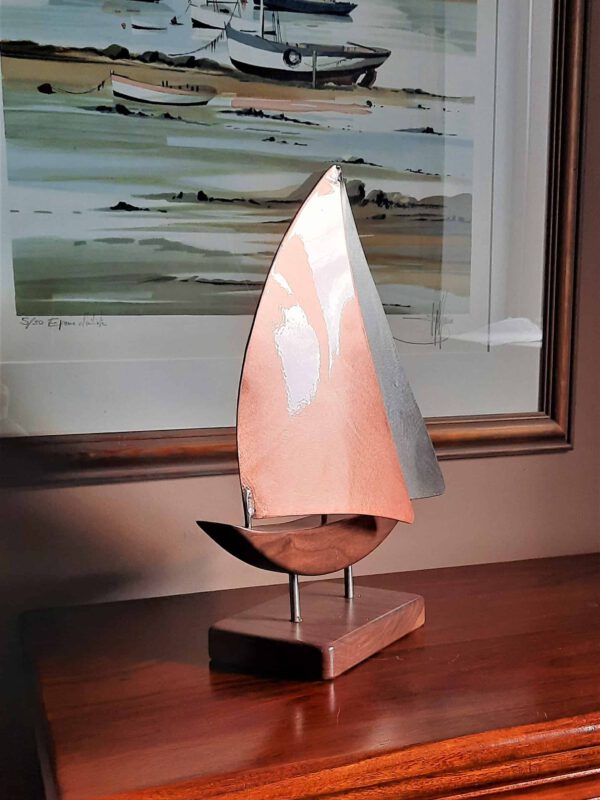 She has a Brushed Copper Headsail contrasting with a Stainless Steel Mainsail. Her Walnut Hull is crescent shaped, sailing on a starboard tack.